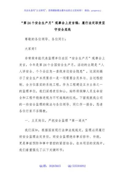 / “第24个安全生产月”观摩会上发言稿:履行法定职责坚守安全底线