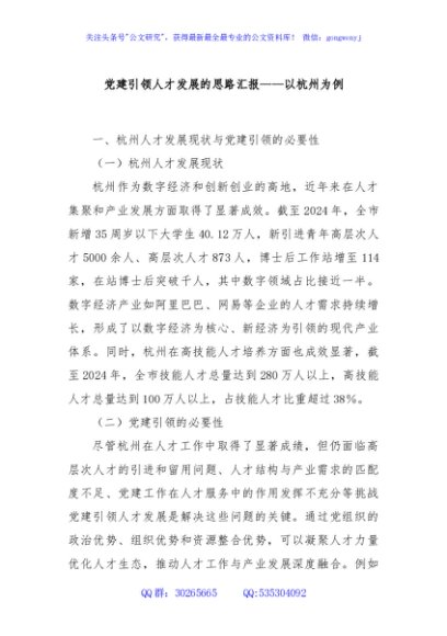 / 党建引领人才发展的思路汇报——以杭州为例