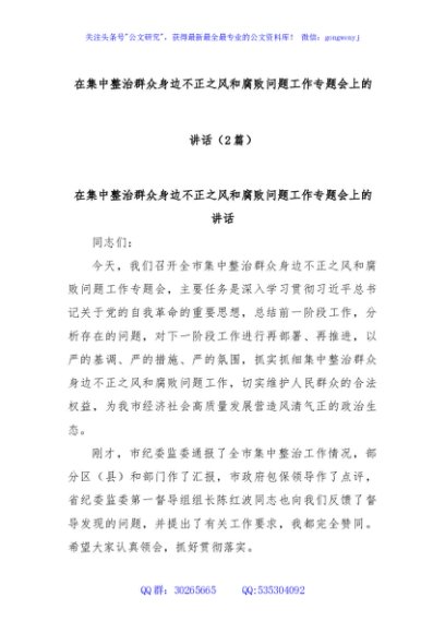 / (2篇)在集中整治群众身边不正之风和腐败问题工作专题会上的讲话