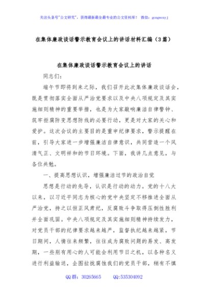 (3篇)在集体廉政谈话警示教育会议上的讲话材料汇编