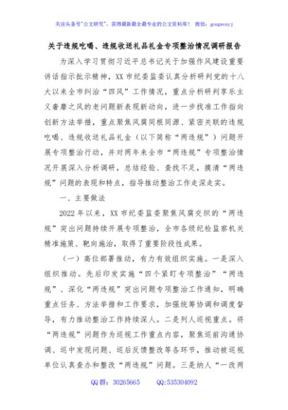 / 关于违规吃喝、违规收送礼品礼金专项整治情况调研报告