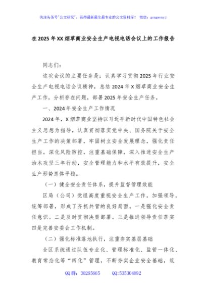 / 在2025年XX烟草商业安全生产电视电话会议上的工作报告