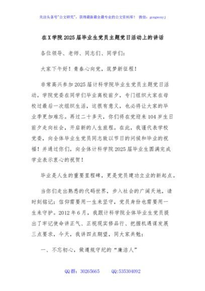 / 在X学院2025届毕业生党员主题党日活动上的讲话