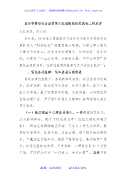/ 在全市基层社会治理现代化创新经验交流会上的发言