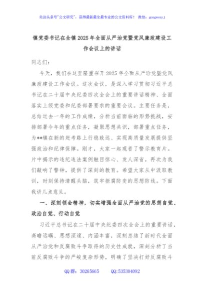 / 镇党委书记在全镇2025年全面从严治党暨党风廉政建设工作会议上的讲话