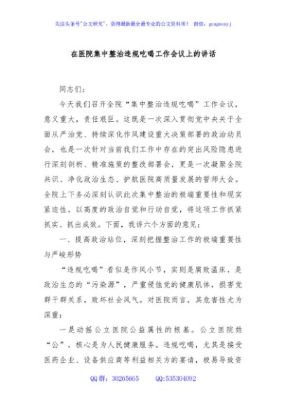 / 在医院集中整治违规吃喝工作会议上的讲话