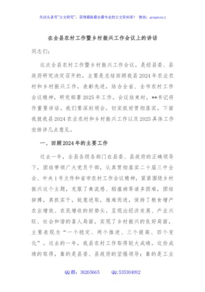 / 在全县农村工作暨乡村振兴工作会议上的讲话