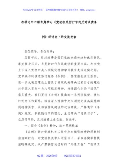 / 在理论中心组专题学习《党政机关厉行节约反对浪费条例》研讨会上的交流发言