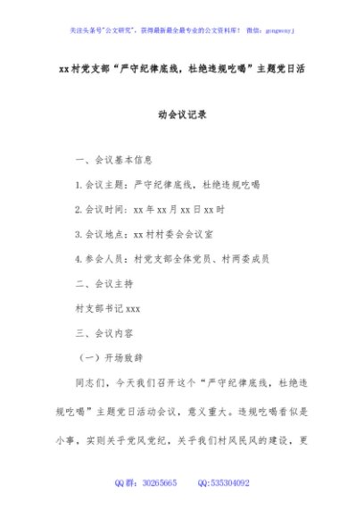 / xx村党支部“严守纪律底线,杜绝违规吃喝”主题党日活动会议记录