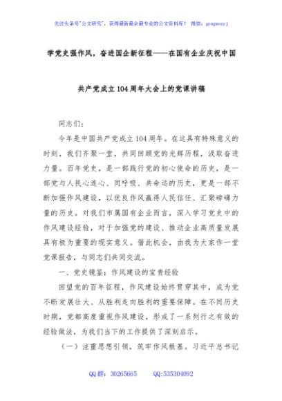 / 学党史强作风,奋进国企新征程——在国有企业庆祝中国共产党成立104周年大会上的党课讲稿