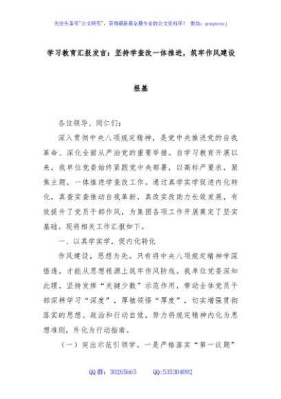 / 学习教育汇报发言:坚持学查改一体推进,筑牢作风建设根基