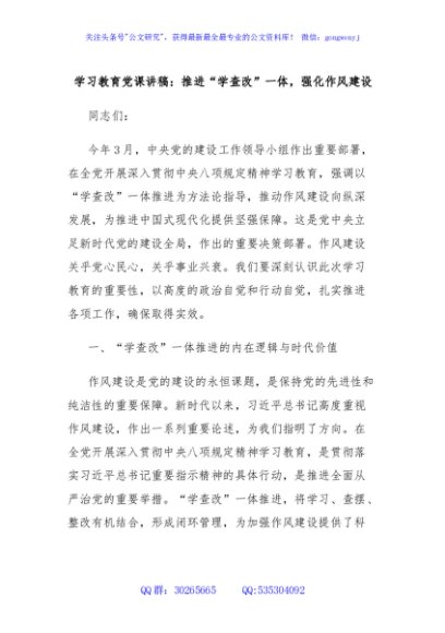 / 学习教育党课讲稿:推进“学查改”一体,强化作风建设