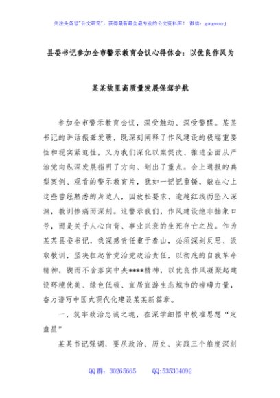 / 县委书记参加全市警示教育会议心得体会:以优良作风为某某故里高质量发展保驾护航