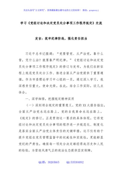 / 学习《党组讨论和决定党员处分事项工作程序规定》交流发言:筑牢纪律防线,强化责任担当