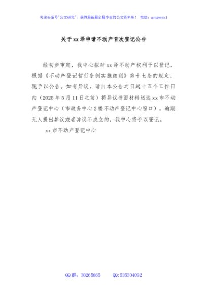 / 关于xx泽申请不动产首次登记公告