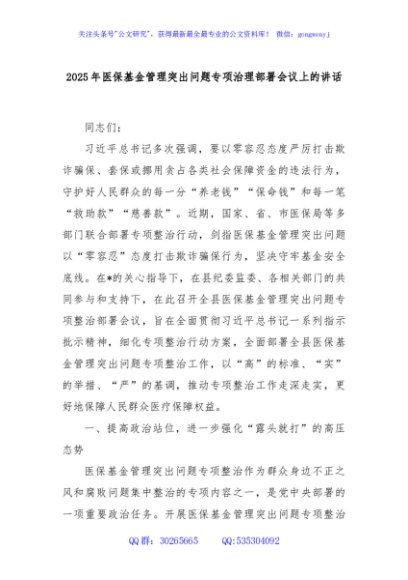 / 2025年医保基金管理突出问题专项治理部署会议上的讲话