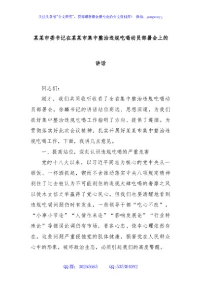 / 某某市委书记在某某市集中整治违规吃喝动员部署会上的讲话