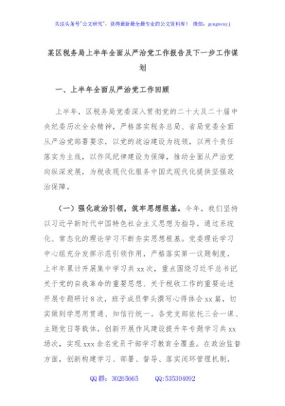 / 某区税务局上半年全面从严治党工作报告及下一步工作谋划