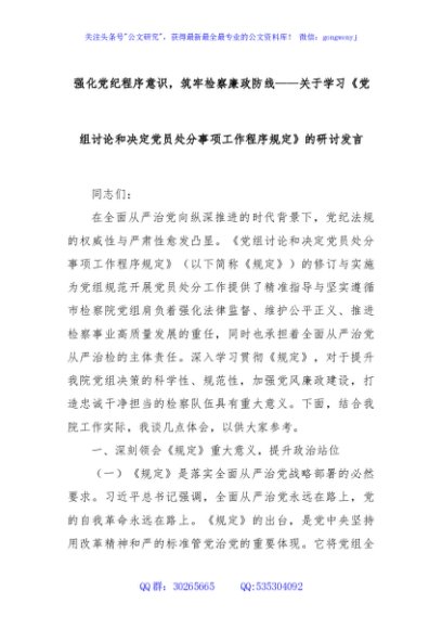 / 强化党纪程序意识,筑牢检察廉政防线——关于学习《党组讨论和决定党员处分事项工作程序规定》的研讨发言