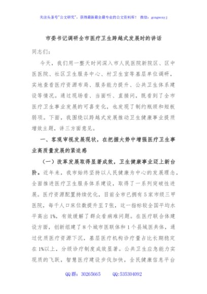 / 市委书记调研全市医疗卫生跨越式发展时的讲话
