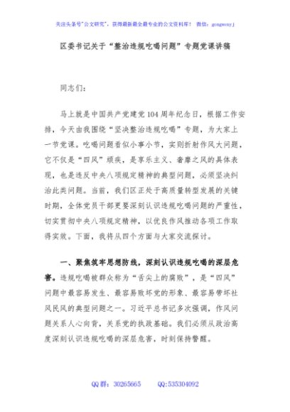 / 区委书记关于“整治违规吃喝问题”专题党课讲稿