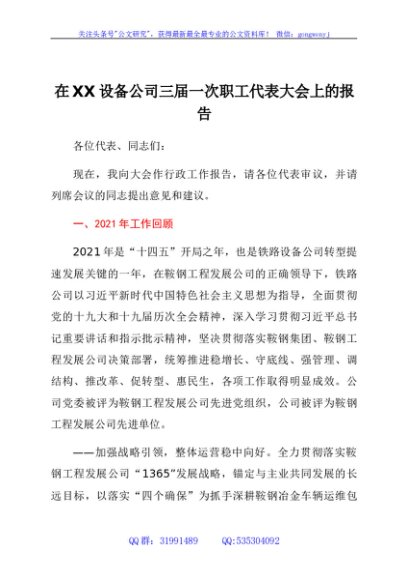 / 国企设备公司三届一次职工代表大会上的报告