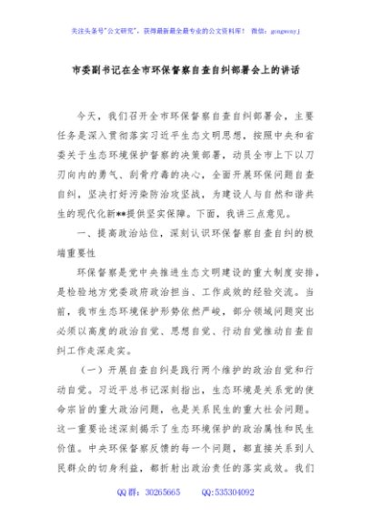 / 市委副书记在全市环保督察自查自纠部署会上的讲话