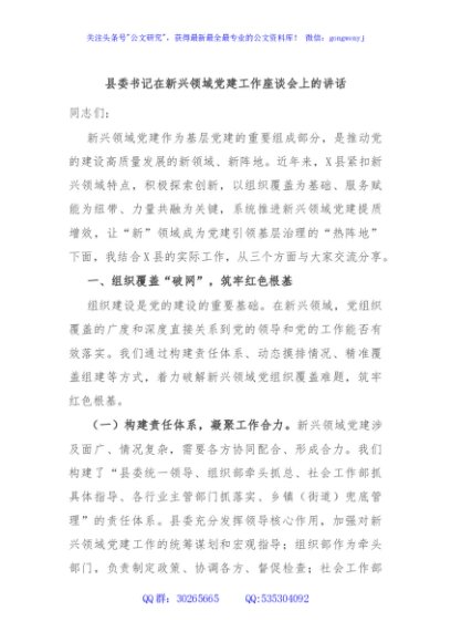 / 县委书记在新兴领域党建工作座谈会上的讲话