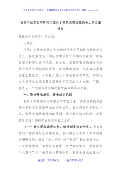 / 县委书记在全市新时代党员干部队伍建设座谈会上的汇报发言