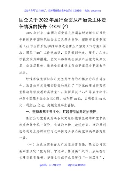 / 国企关于2022年履行全面从严治党主体责任情况的报告