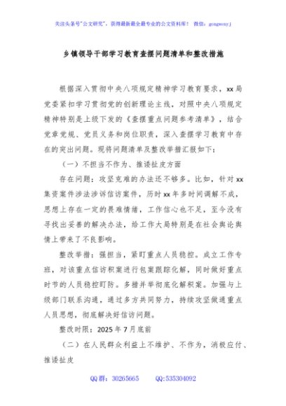 乡镇领导干部学习教育查摆问题清单和整改措施