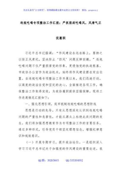 / 违规吃喝专项整治工作汇报:严抓狠刹吃喝风,风清气正促履职