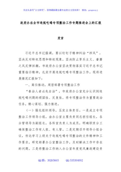 / 政府办在全市违规吃喝专项整治工作专题推进会上的汇报发言
