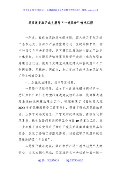 / 县委常委班子成员履行“一岗双责”情况汇报