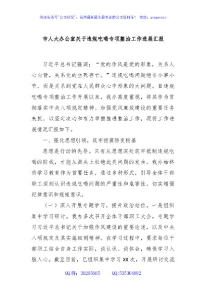 / 市人大办公室关于违规吃喝专项整治工作进展汇报