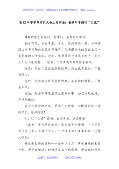 / 在XX中学中考动员大会上的讲话:奋战中考践行“三此”