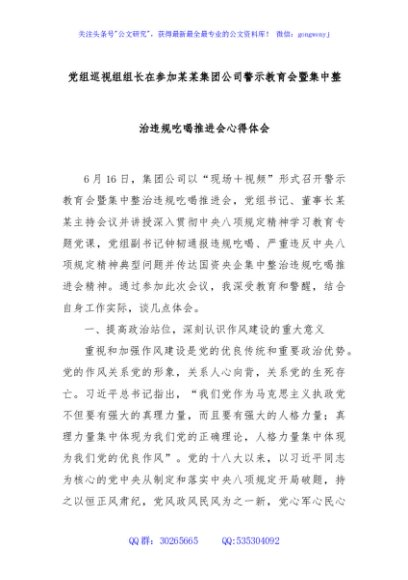 / 党组巡视组组长在参加某某集团公司警示教育会暨集中整治违规吃喝推进会心得体会