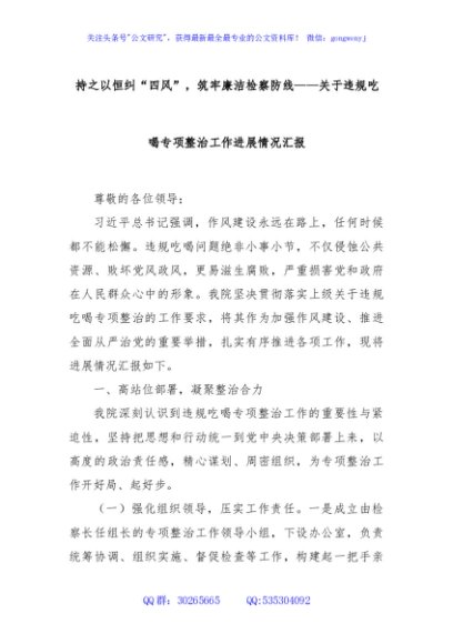 / 持之以恒纠“四风”,筑牢廉洁检察防线——关于违规吃喝专项整治工作进展情况汇报