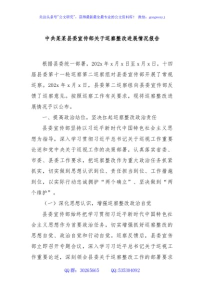 / 中共某某县委宣传部关于巡察整改进展情况报告