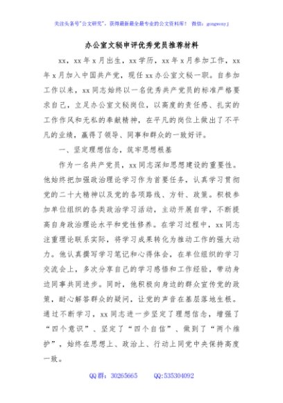 / 办公室文秘申评优秀党员推荐材料