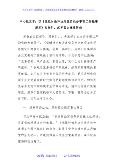 / 中心组发言:以《党组讨论和决定党员处分事项工作程序规定》为指引,筑牢国企廉政防线