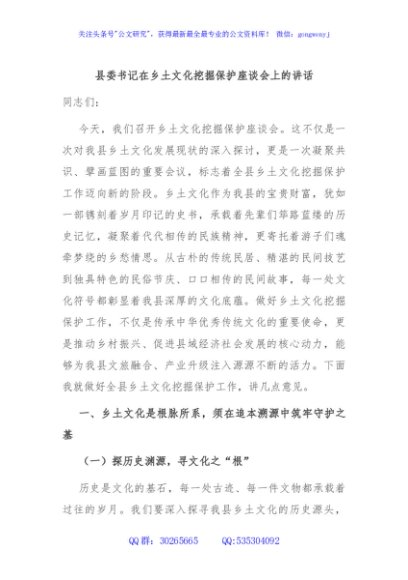 / 县委书记在乡土文化挖掘保护座谈会上的讲话