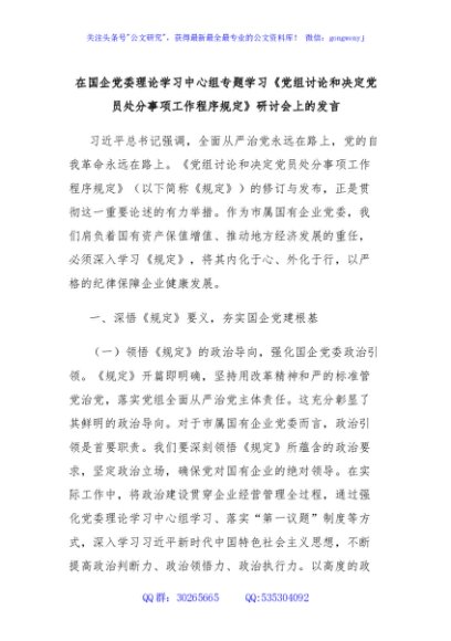 / 在国企党委理论学习中心组专题学习《党组讨论和决定党员处分事项工作程序规定》研讨会上的发言