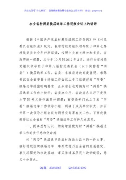 / 在全省村两委换届选举工作视频会议上的讲话
