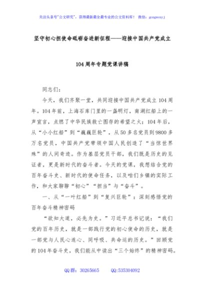 / 坚守初心担使命砥砺奋进新征程——迎接中国共产党成立104周年专题党课讲稿