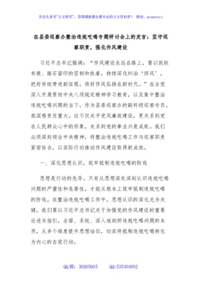 / 在县委巡察办整治违规吃喝专题研讨会上的发言:坚守巡察职责,强化作风建设