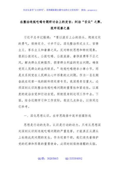 / 在整治违规吃喝专题研讨会上的发言:纠治“舌尖”之弊,筑牢巡察之基