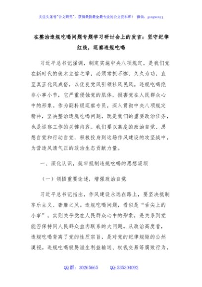 / 在整治违规吃喝问题专题学习研讨会上的发言:坚守纪律红线,巡察违规吃喝