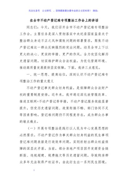 / 在全市不动产登记难专项整治工作会上的讲话
