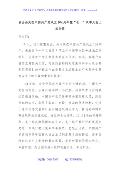 / 在全县庆祝中国共产党成立104周年暨“七一”表彰大会上的讲话